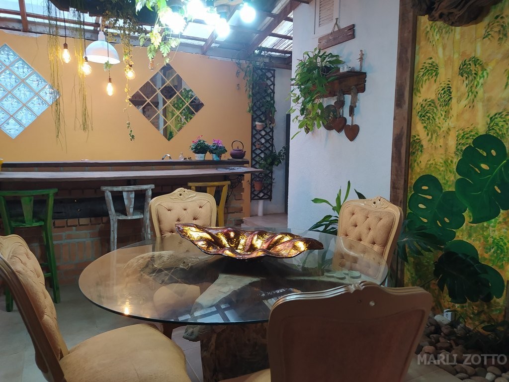 INTERNAMENTE: Copa e cozinha conjugadas com saída para um espaço externo charmoso, com viveiro de plantas. Sala de estar com sofá super confortável, TV, 3 dormitórios com camas de casal e 1 colchão extra (se necessário), banheiro completo. Ar condicionado em um dos dormitórios, ventiladores de teto nos demais. O imóvel está bem mobiliado, a cozinha bem equipada com fogão de lenha, fogão de mesa, forno elétrico, panela e chaleira elétrica, microondas, liquidificador, louças, panelas, talheres e demais utensílios suficientes para atender até 8 pessoas confortavelmente.