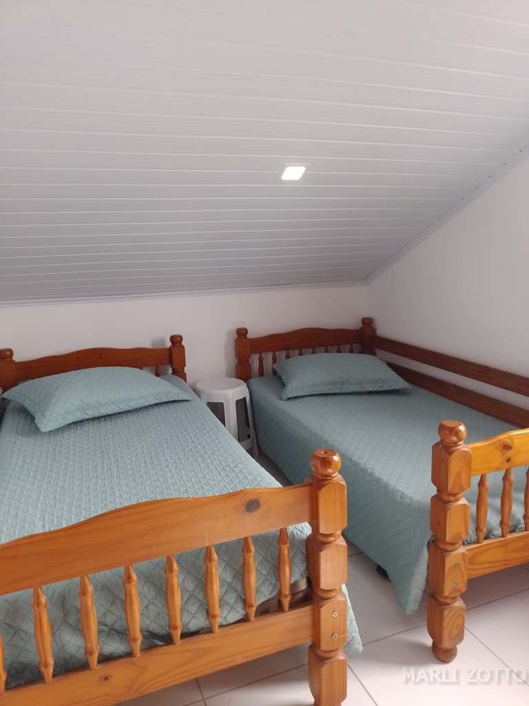 INTERNAMENTE: Piso térreo cozinha bem equipada , com armários, geladeira duplex, fogão 4 bocas, forno elétrico, micro-ondas, liquidificador, batedeira, bancada com pia; louças, panelas, talheres e demais equipamentos suficientes para atender até 10 pessoas. Banheiro social completo, saída para varanda . Piso superior : acesso pela churrasqueira, Sala de estar com TV, sofá cama, banheiro completo, mais 1 dormitório com cama de casal, ar condicionado, 1 dormitório contendo 3 camas de casal (sendo cada cama separada por parede em madeira) e acesso por espaço de uso comum. COLCHÕES novos e excelentes.